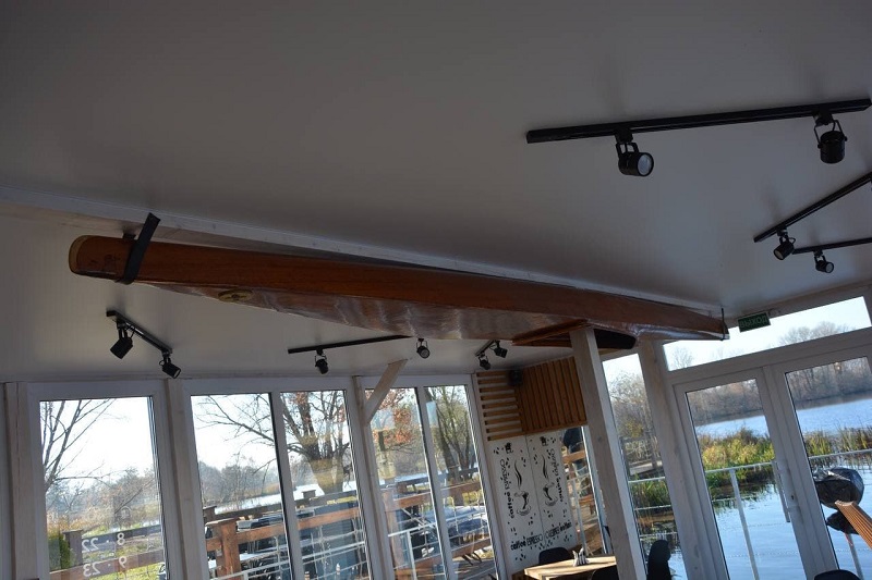 В интерьер органично вписалась почти шестиметровая старая байдарка 1980 года, сделанная из красного дерева. Как отмечает владелец кафе, байдарка участвовала в соревнованиях на Олимпийских играх 1980 года в Москве.