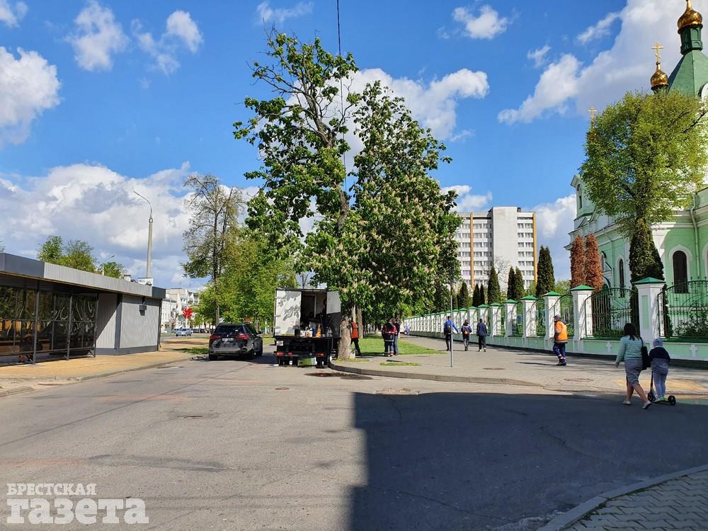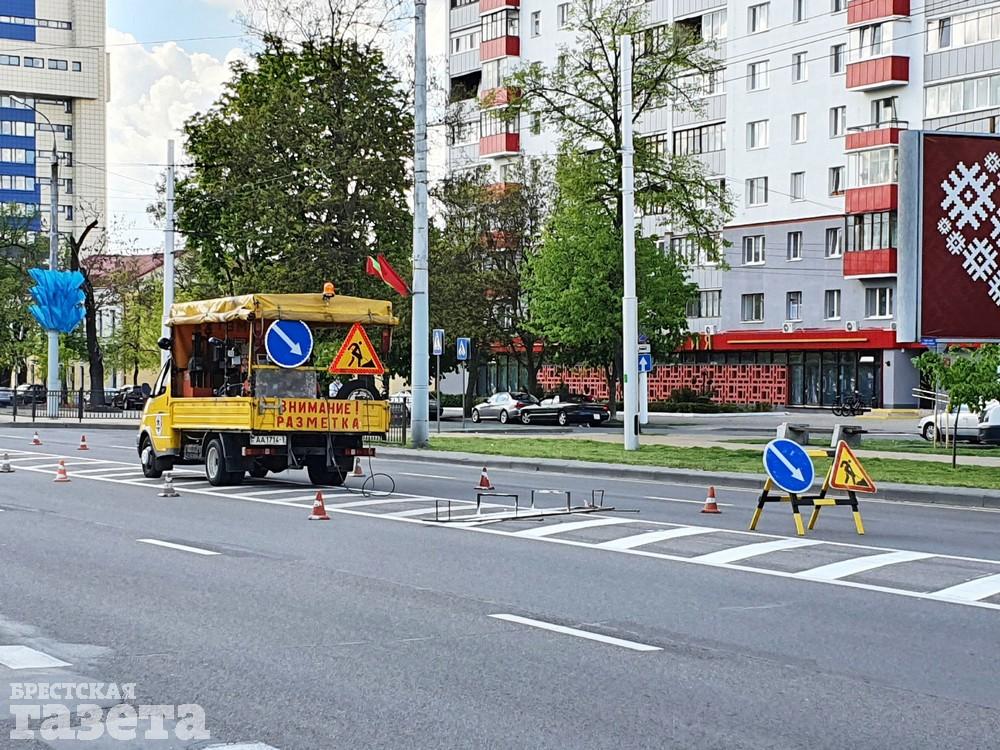 В четверг 7 мая в Бресте обновляли дорожную разметку на главных улицах. Корреспондент «БГ» застала работников дорожных служб в этот день на улице Ленина и на проспекте Машерова.