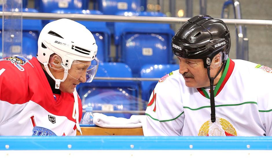 После трех дней переговоров, в ходе которых главы двух государств обсуждали различные аспекты сотрудничества России и Беларуси, в пятницу вечером Владимир Путин и Алексндр Лукашенко надели хоккейную форму, чтобы сыграть в одном из самых современных спортивных комплексов России.