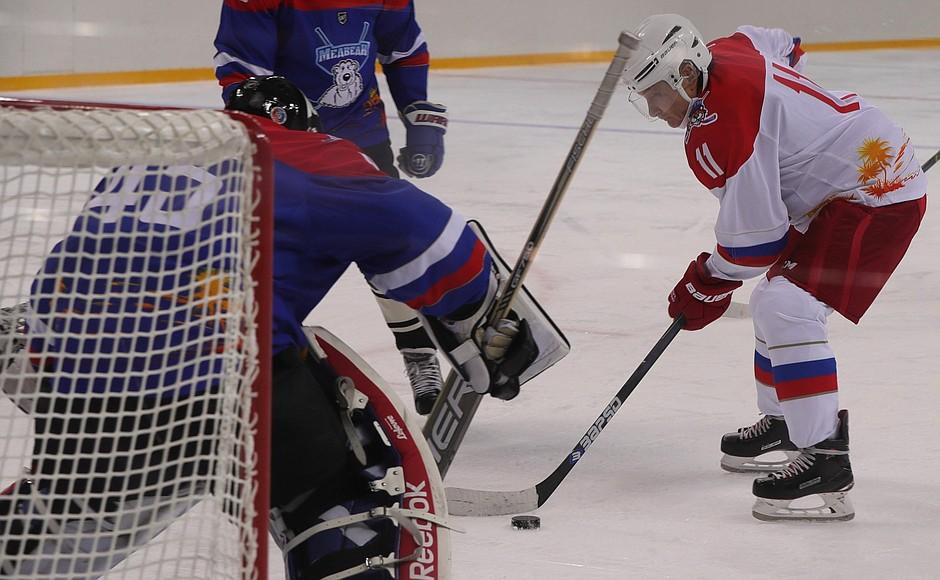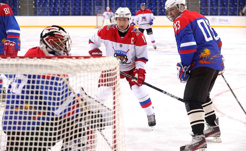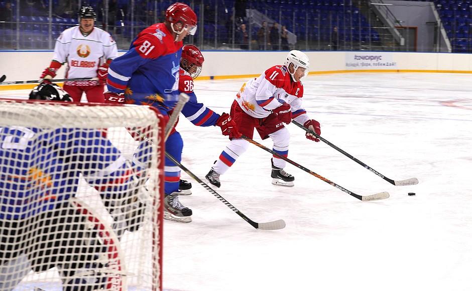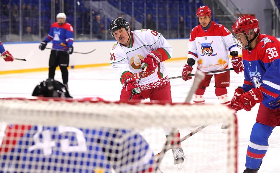 Российский и белорусский лидеры играли в команде «Тигры» против «Медведей». Вместе с президентом Беларуси, тоже в майке под первым номером, играл и его сын Николай, который забил одну из первых шайб. Итоговый счет — 16:1.