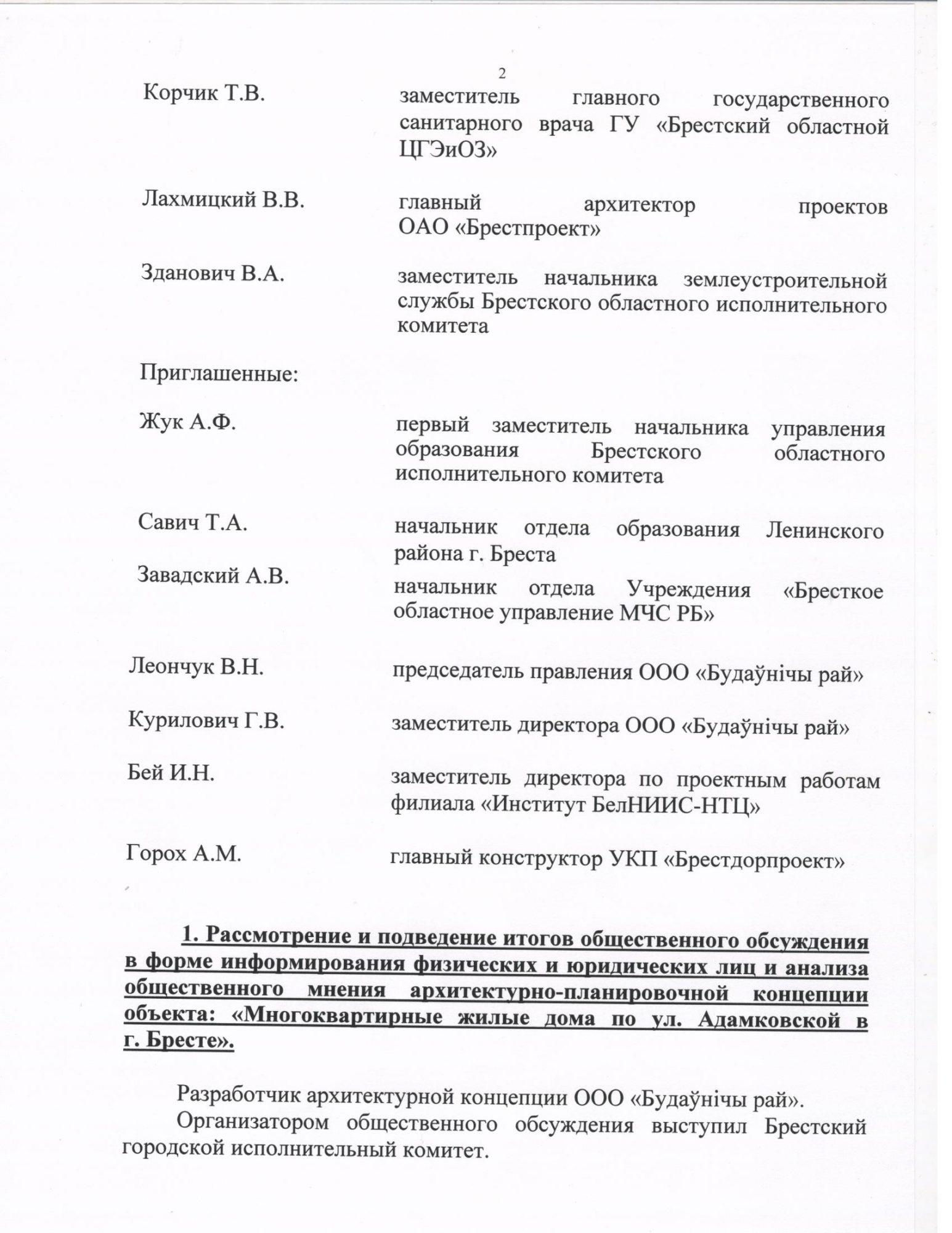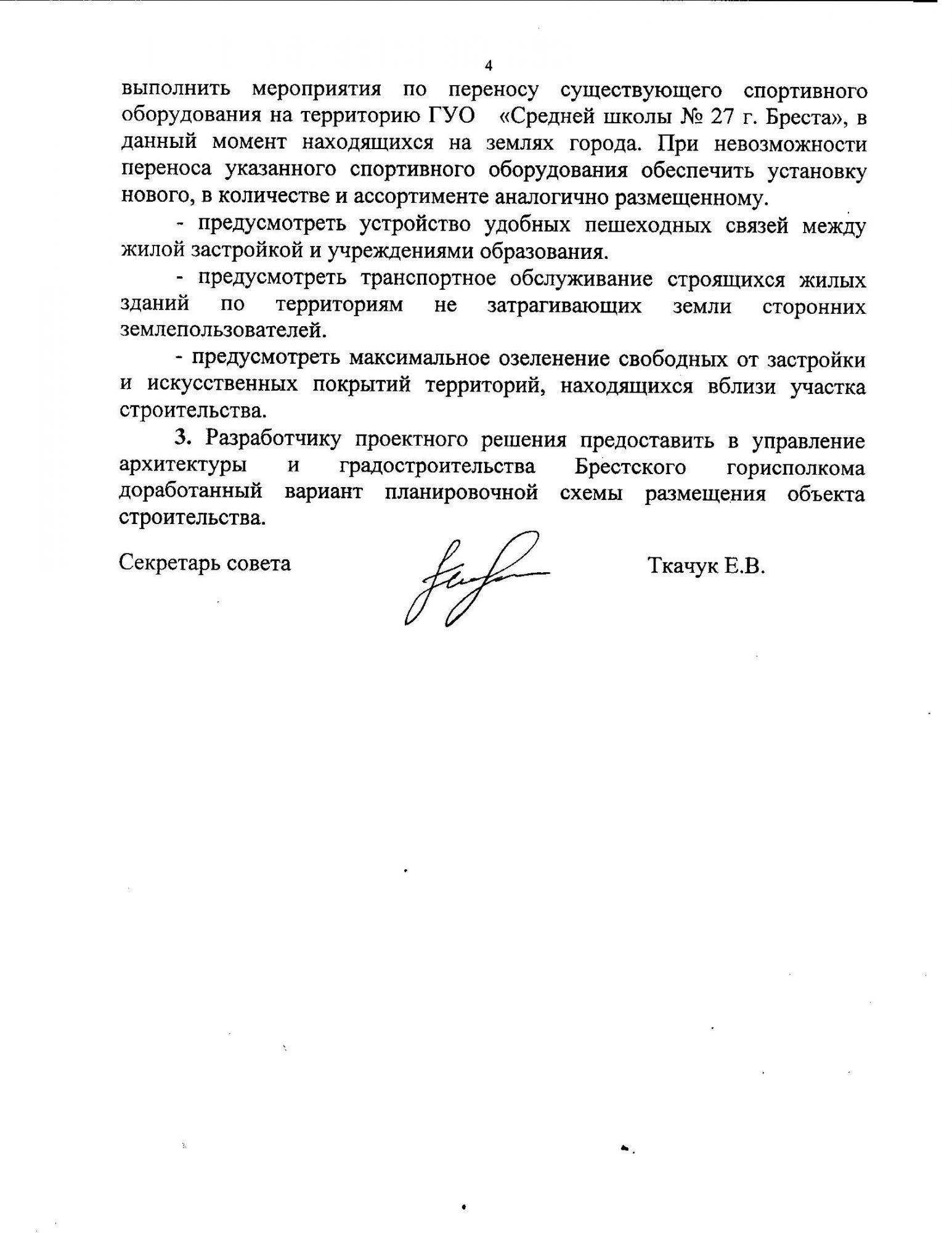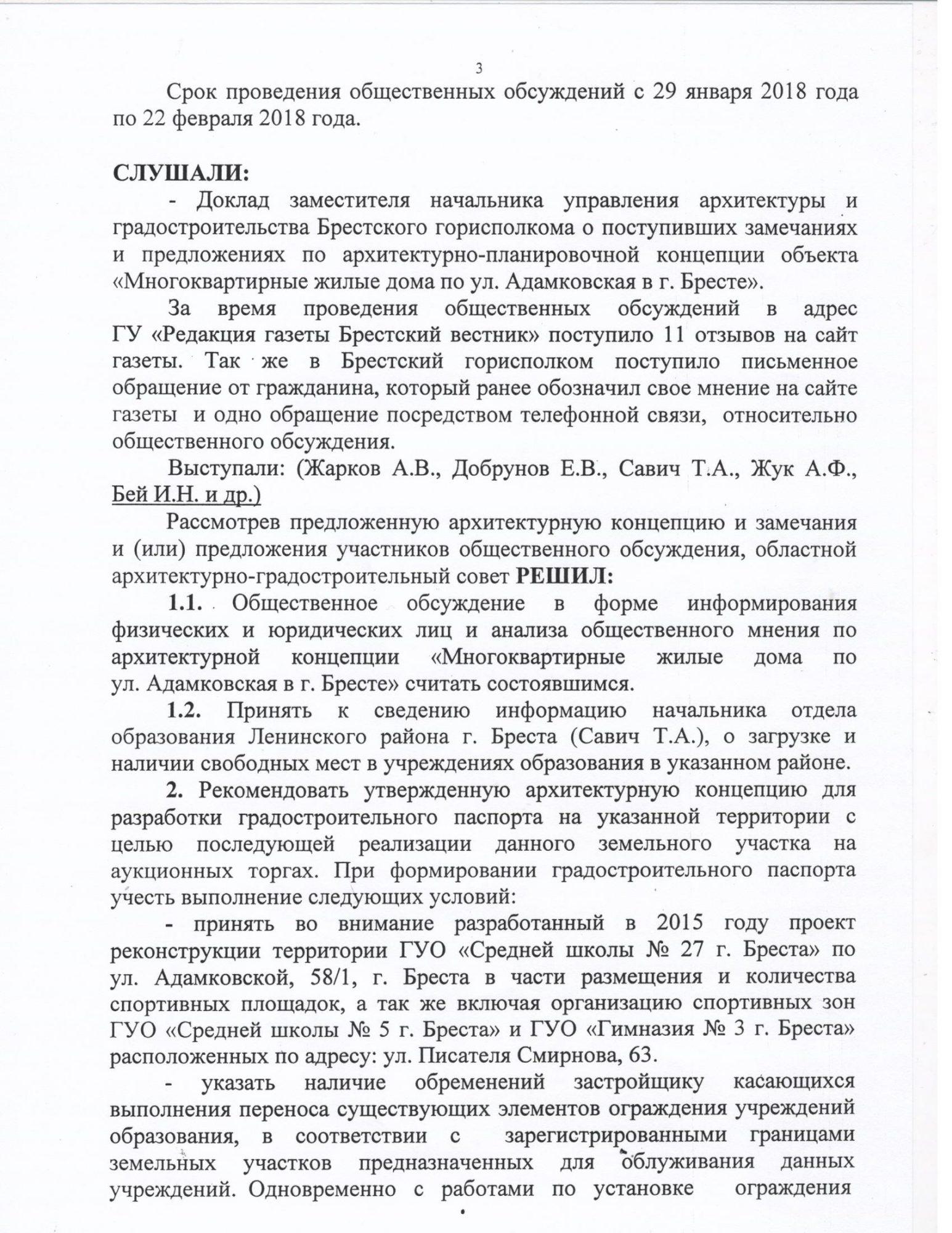 Одно из них изложено так: «Принять во внимание разработанный в 2015 году проект реконструкции территории ГУО «Средняя школа № 27 г. Бреста» по ул. Адамковской 58/1 в части размещения и количества спортивных площадок, а также включая организацию спортивных зон ГУО «Средняя школа №5 г. Бреста» и ГУО «Гимназия №3 г. Бреста», расположенных по адресу: ул. Писателя Смирнова, 63»;