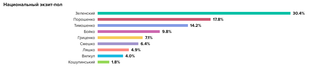 Первый тур президентских выборов в Украине, прошедший 31 марта, судя по данным экзит-пола выиграл шоумен Владимир Зеленский, пишет tut.by.