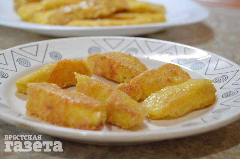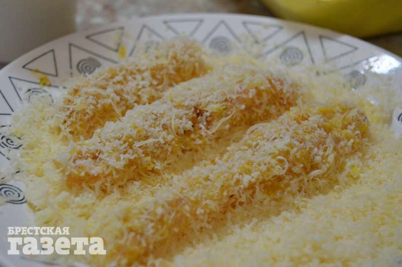 Обваляйте куриные полоски в муке, затем в яйце и в завершение — в сырной крошке.