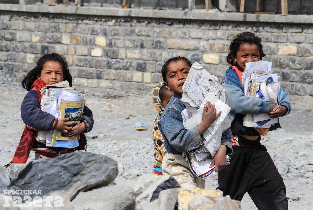 Эти ребятишки живут в глухой деревушке Непала, глубоко в Гималайских горах. Какая-то благотворительная организация привезла им учебники в школу, и дети несут домой книги, тетрадки и листочки целыми охапками. Такие простые вещи, как цветные карандаши и листы белой бумаги, здесь роскошь.
