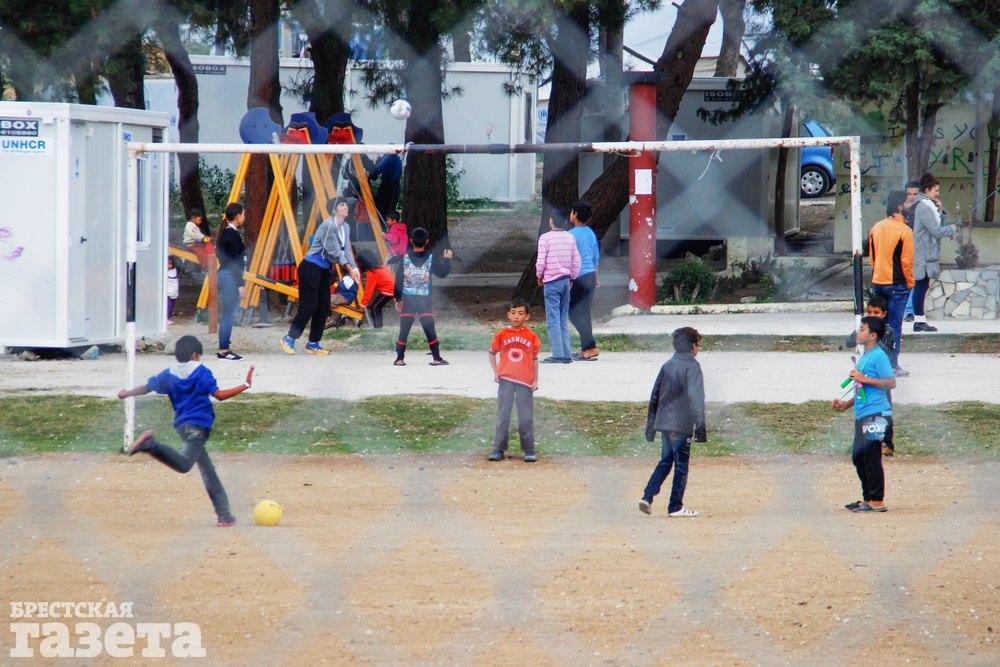Сирийские ребятишки играют в футбол на территории лагеря для беженцев в Греции. Территория охраняется полицейскими, и без особой надобности ребята за стены лагеря не выходят. Но в дальнем углу огороженной территории в заборе есть большая дыра, которой дети постоянно пользуются. Когда я попробовала туда пролезть, местная детвора быстро собралась и стала бросать в меня камни — чужаков здесь не любят.