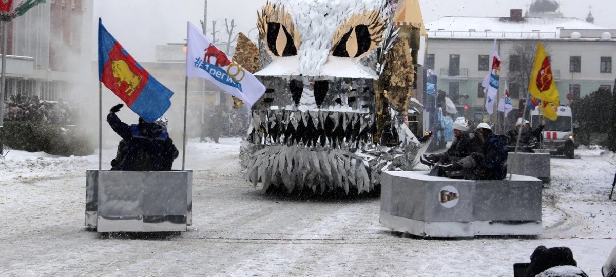 Парад стилизованных пратформ предприятий на фестивале «Берестейские сани». 20 января 2024 года
