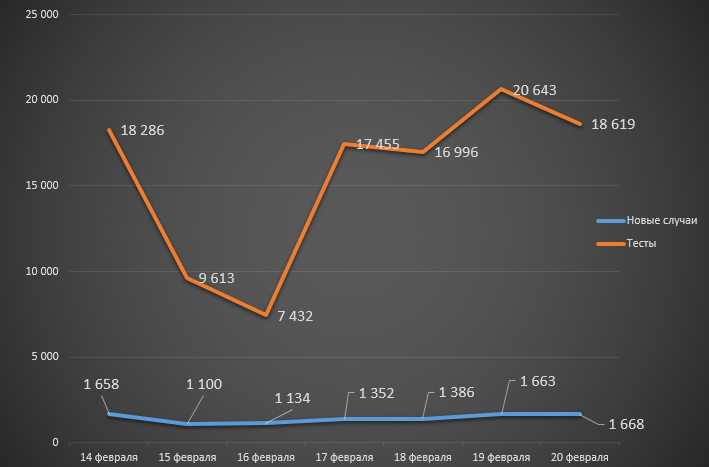 Продолжая следить за ковидными показателями в недельном цикле, можно сделать вывод, что заболеваемость, по официальной статистике, продолжает незначительно снижаться: если с 7 по 13 февраля (напомним, мы выбрали диапазон с воскресенья по субботу) в стране было выявлено 10 070 инфицированных, то за период с 14 по 20 февраля – на 109 случаев меньше (9 961).