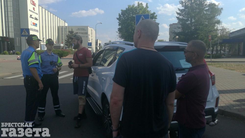 Около 16.35 сотрудники остановили автомобиль, который сигналил цепи солидарности. За его стеклом — листок, на котором напечатано «Светлана Тихановская — мой президент». По его словам, у него забрали водительские права и техпаспорт.